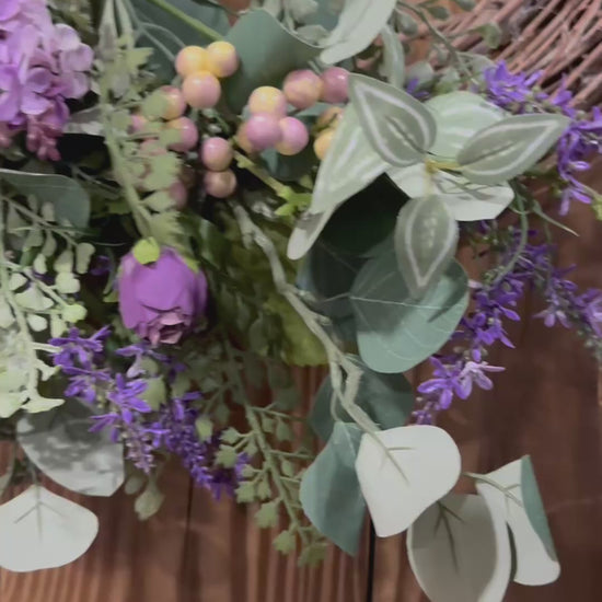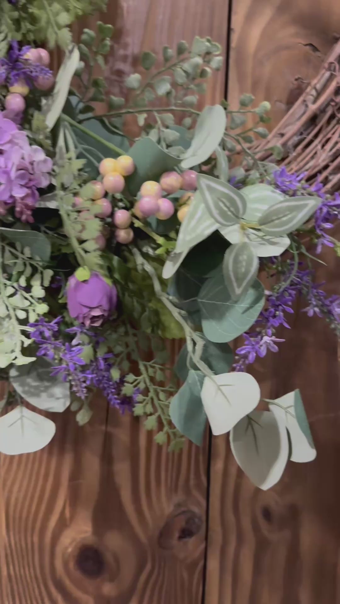 Violet Grace is a handcrafted floral wreath designed by Carolyn using premium faux florals in soft lavender and deep violet tones. Built on a sturdy grapevine base, this richly layered wreath features a blend of elegant greenery, textured blooms, and natural accents for a beautifully realistic and timeless design.